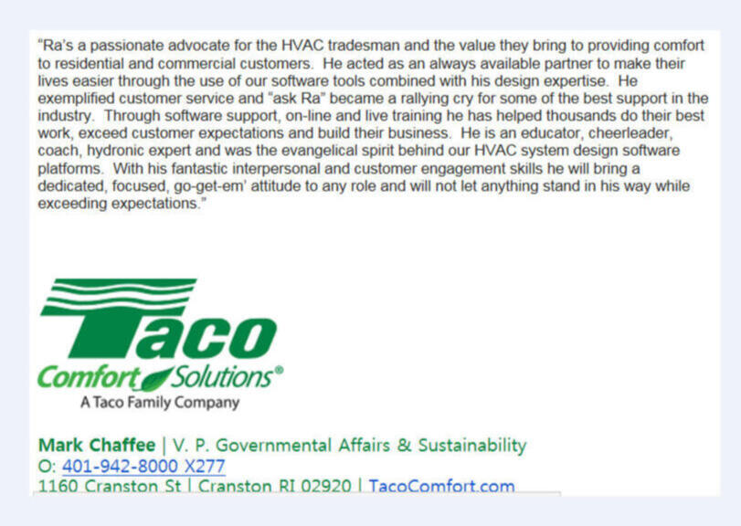 Traveled across the USA and to 15 countries training MEP engineers to use Taco HSS software and HVAC Solution Professional / 15 years